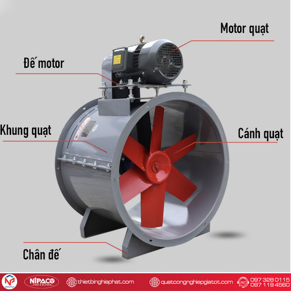 Nguyên lý hoạt động: Motor quay → truyền chuyển động qua dây curoa → puli gắn trên trục quạt quay → cánh quạt tạo ra luồng khí song song với trục → không khí được hút vào và đẩy ra ngoài một cách liên tục, ổn định.